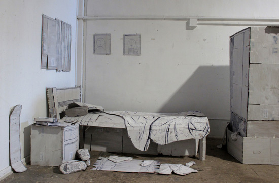 give the space a surreal quality of a drawing that has come to life. Take a tour of the rest of his cardboard creations here.